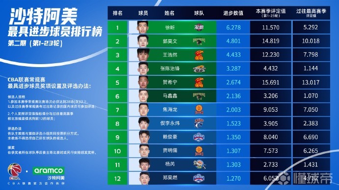 北京时间2月7日,CBA官方公布了联赛第1-23轮最具进步球员排名,广州队球员徐昕继续排名第一位。