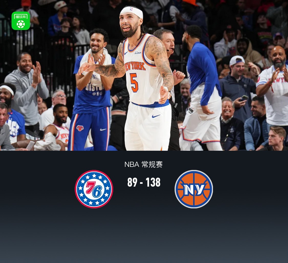 尼克斯138-89大胜76人49分,阿尔瓦拉多26分,马克西空砍32分
