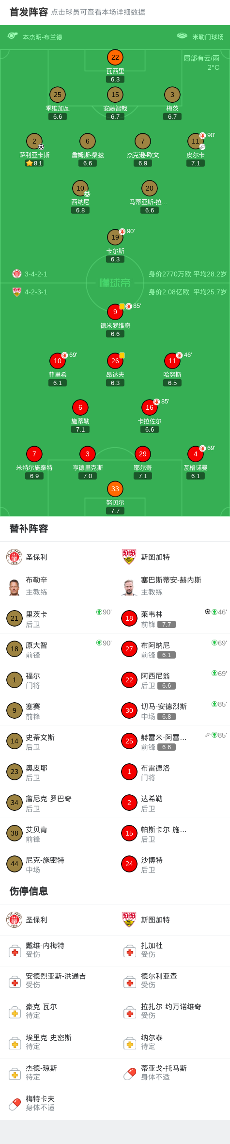 北京时间2月7日德国足球顶级联赛 联赛 第21轮,圣保利主场对阵斯图加特。圣保利萨利亚卡斯破门,西纳尼破门。斯图加特莱韦林破门。最终比分圣保利 2-1 斯图加特。