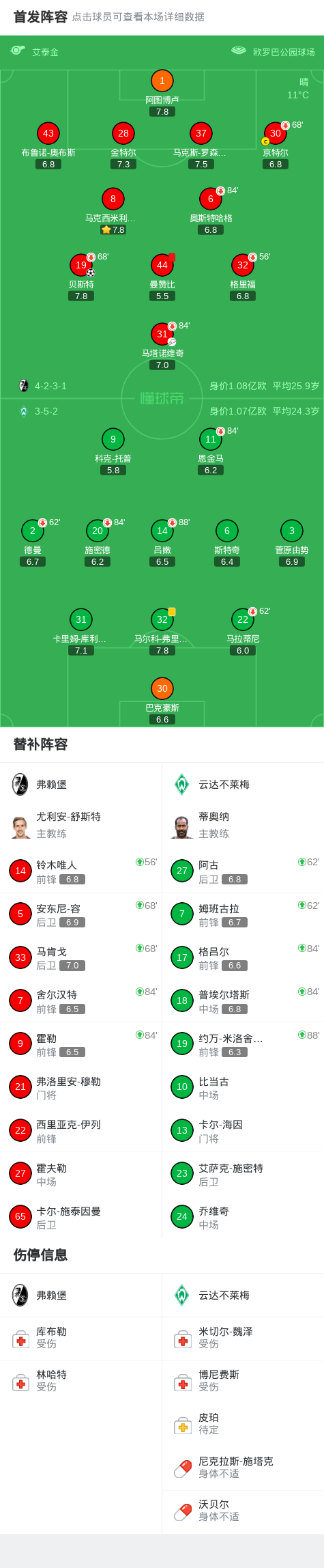 第13分钟,弗赖堡球员马塔诺维奇助攻贝斯特打入一球。
