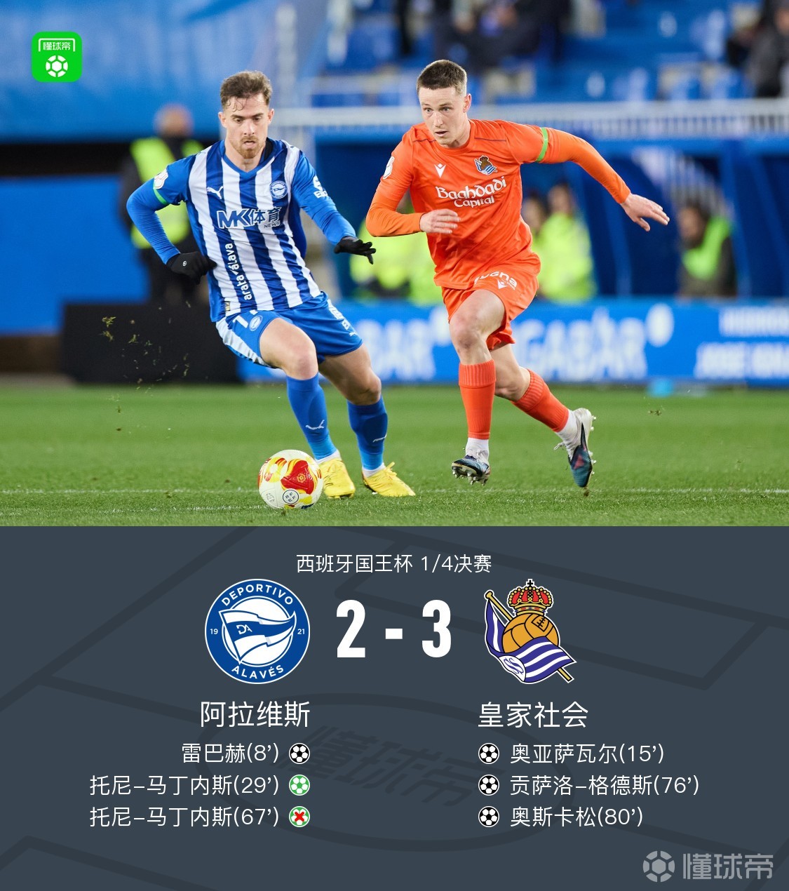 北京时间2月5日西班牙国王杯 1/4决赛,阿拉维斯对阵皇家社会。阿拉维斯雷巴赫破门,托尼-马丁内斯破门。皇家社会奥亚萨瓦尔破门,贡萨洛-格德斯破门,奥斯卡松破门。最终比分阿拉维斯 2-3 皇家社会。