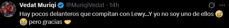 这位科索沃国脚也在社媒幽默地回应道:“能和莱万相提并论的前锋没几个……而我可不是其中之一啊,但还是谢谢了。”