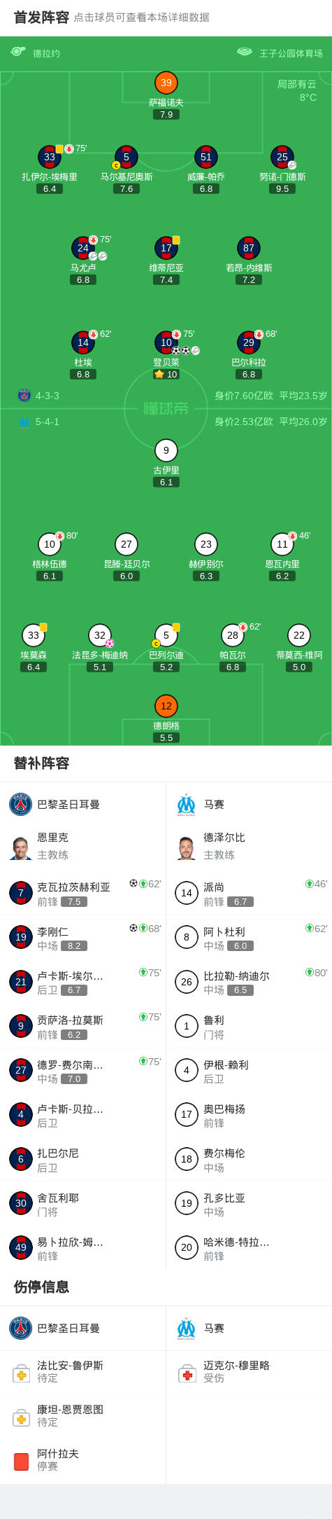 第12分钟,门德斯传中,登贝莱推射破门,巴黎1-0马赛