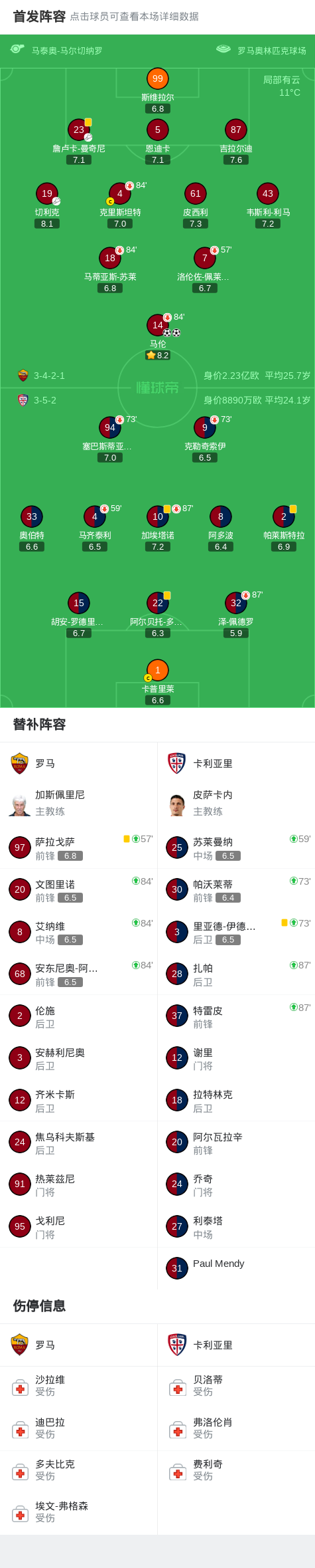 北京时间2月10日意大利足球顶级联赛第24轮,罗马主场对阵卡利亚里。比赛中,罗马球员先后通过两次团队配合,由马伦完成进球,最终罗马以2-0战胜卡利亚里。
