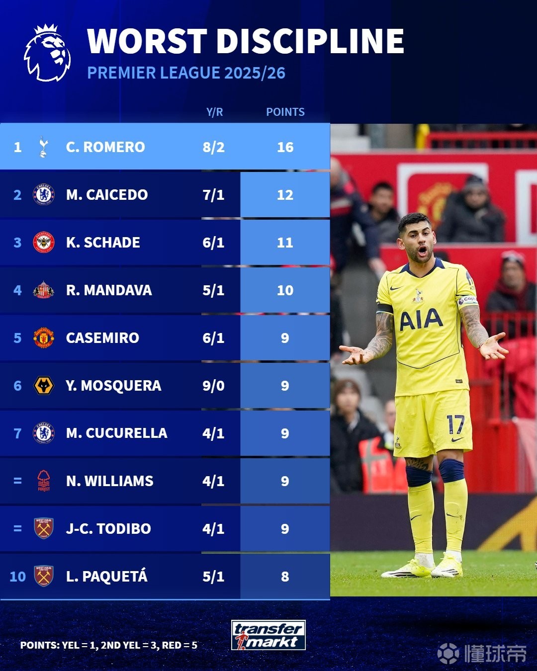 1. 克里斯蒂安-罗梅罗(热刺) 8黄2红 16分