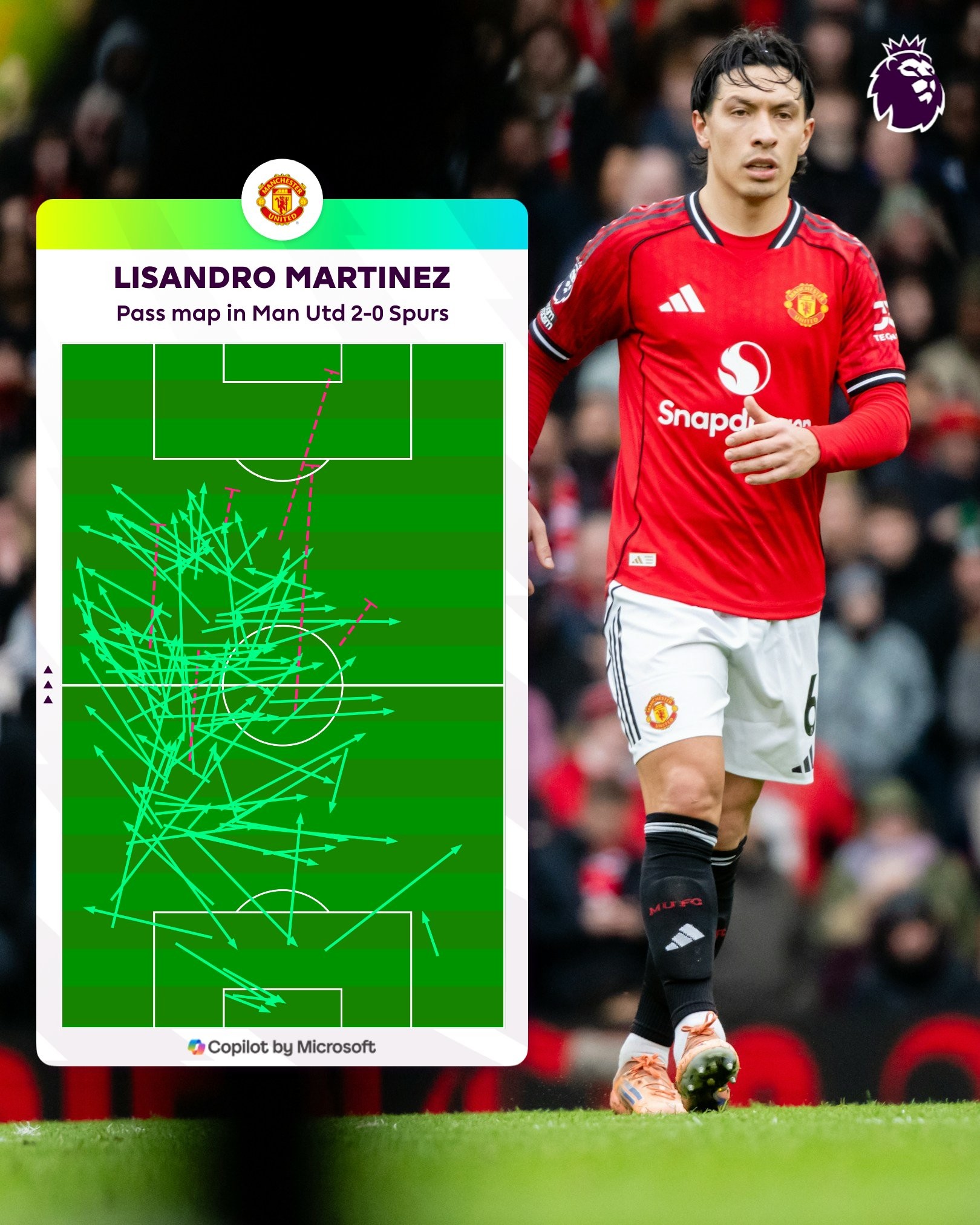 本场比赛,利桑德罗-马丁内斯首发出战并踢满全场,传球总数为109次,精准传球103次,都为本场比赛最高,精准传球103次更是本赛季曼联队内英超单场精准传球次数最多的。