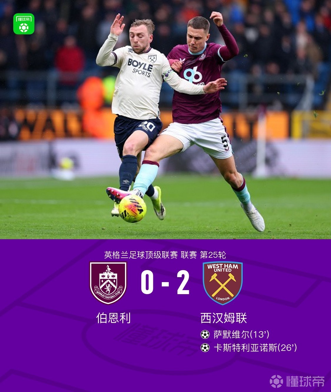 第25分钟,迪乌夫传中,卡斯特利亚诺斯头槌破门,伯恩利0-2西汉姆联