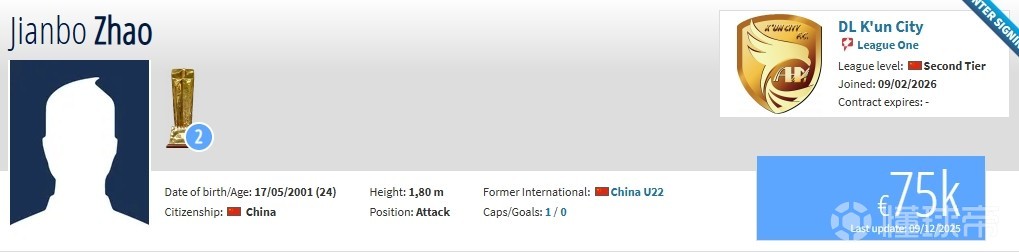 2025赛季结束后,赵健博与辽宁铁人合同到期。现在他在德转上的身价为7.5万欧元。