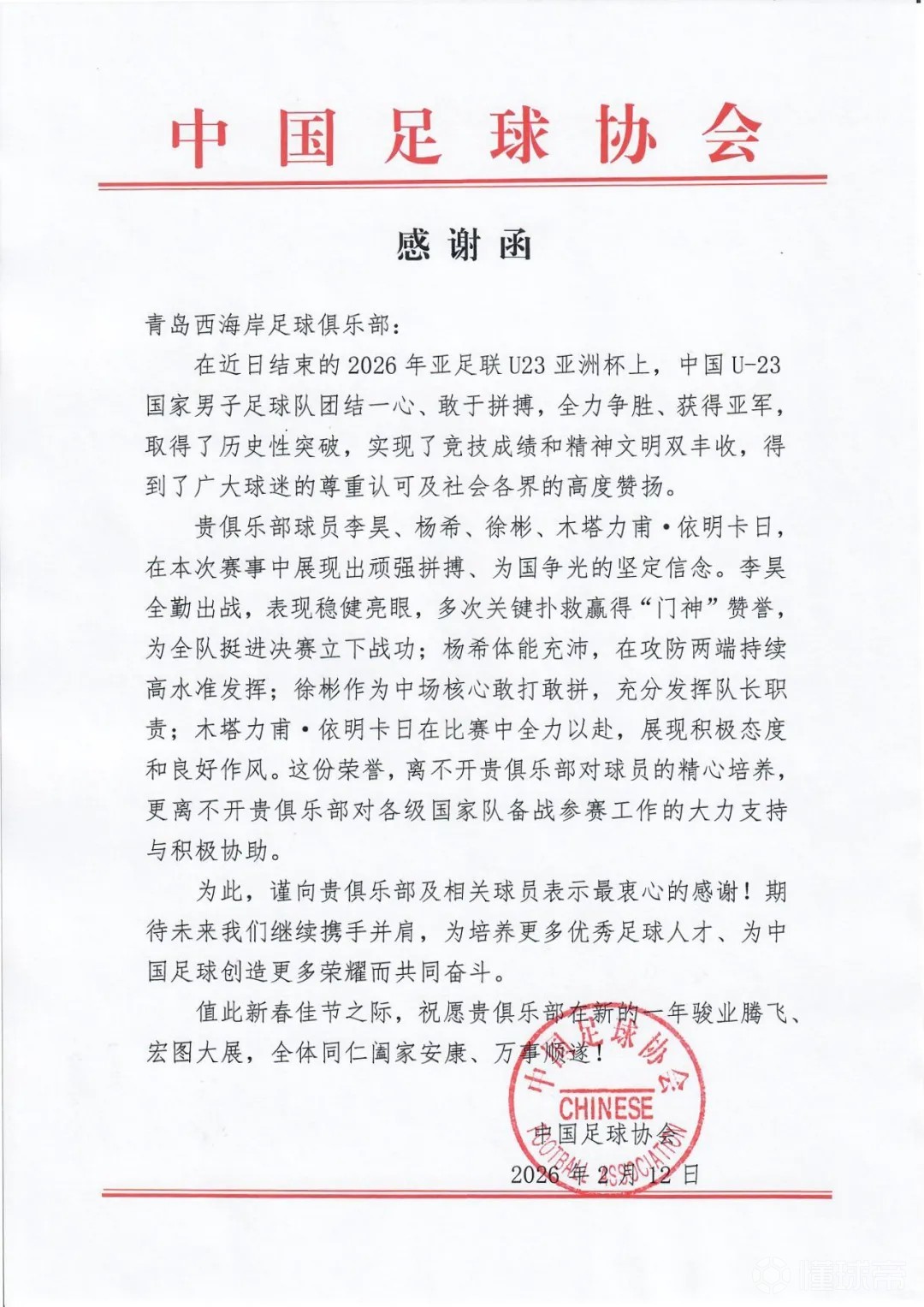 2月12日中国足球协会致函青岛西海岸足球俱乐部,对李昊、杨希、徐彬、木塔力甫-依明卡日在2026年亚足联U23亚洲杯上的出色表现,以及俱乐部对各级国家队备战参赛工作的大力支持,表示感谢。
