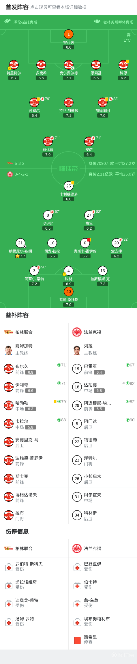 柏林联合1-1十人法兰克福,布朗破门,克尔费尔德点射,霍伊伦染红