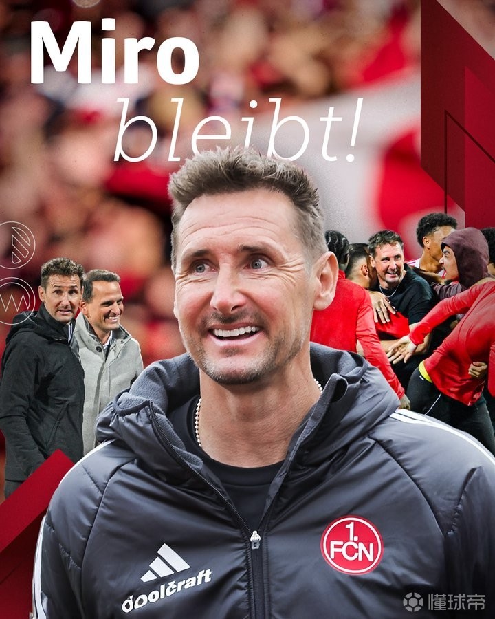 北京时间2月12日,纽伦堡俱乐部官方发布公告,宣布与球队主帅克洛泽续约。