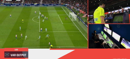 下半场第76分钟,马竞造成迭戈-略伦特不幸乌龙,但VAR介入后判罚格列兹曼越位在先,这粒进球被吹,VAR划线镜头显示,格列兹曼的脚尖稍稍越位。