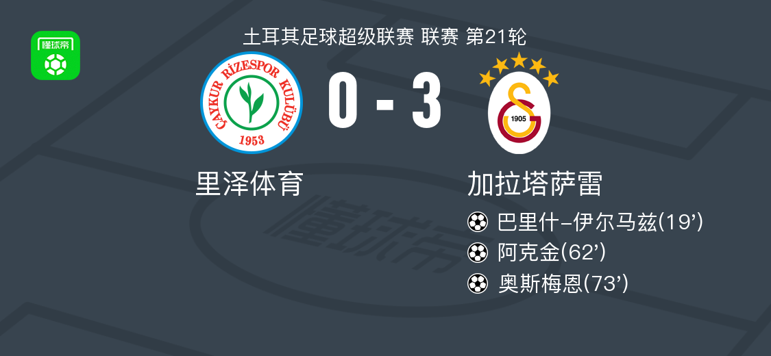 加拉塔萨雷3-0大胜里泽体育,奥斯梅恩建功,阿克金破门