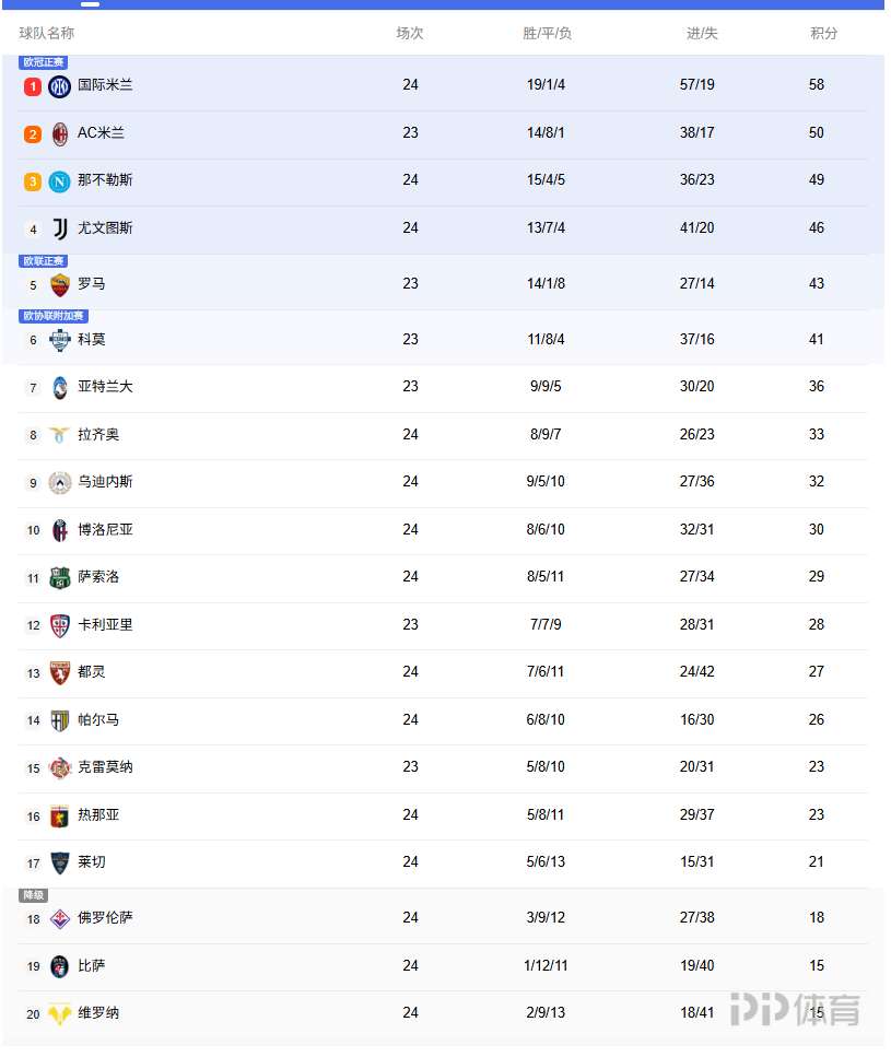意甲积分榜:国米先赛领先AC米兰8分,尤文第四领先罗马3分