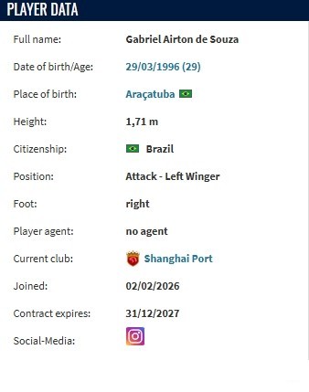 德转显示,加布里埃尔与上海海港签署了一份为期2年的合同。