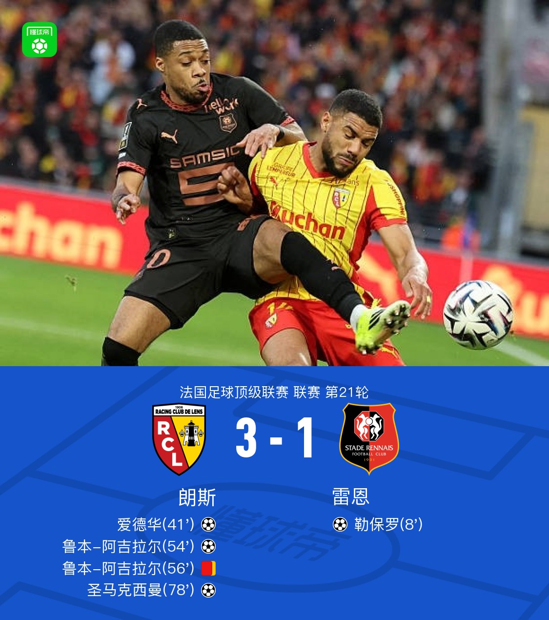 北京时间2月8日法国足球顶级联赛 联赛 第21轮,朗斯主场对阵雷恩。朗斯爱德华破门,鲁本-阿吉拉尔破门,圣马克西曼破门。雷恩勒保罗破门。最终比分朗斯 3-1 雷恩。