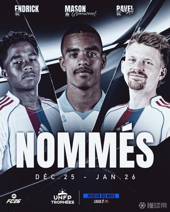 法甲1月最佳球员候选出炉,里昂前锋恩德里克,马赛前锋格林伍德和里昂中场舒尔茨位列名单之中。