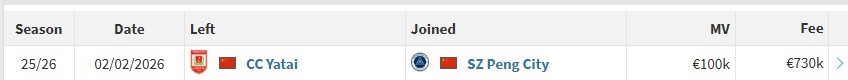 此前,深圳新鹏城官宣20岁小将玄智健从长春亚泰转会加盟。今日,德转更新了玄智健从亚泰加盟深圳新鹏城的转会费,此次转会的费用为73万欧元。