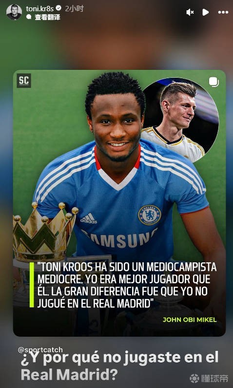 早些时候,米克尔在自己的播客节目中谈到了自己对克罗斯的看法,他表示,自己比克罗斯更优秀,只是没有去皇马,随后,克罗斯本人在社交媒体上进行了回应。