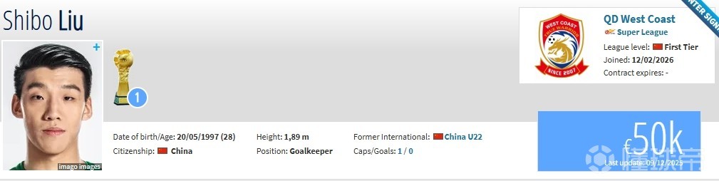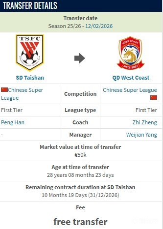 北京时间2月12日,德转更新,山东泰山门将刘世博自由转会青岛西海岸。